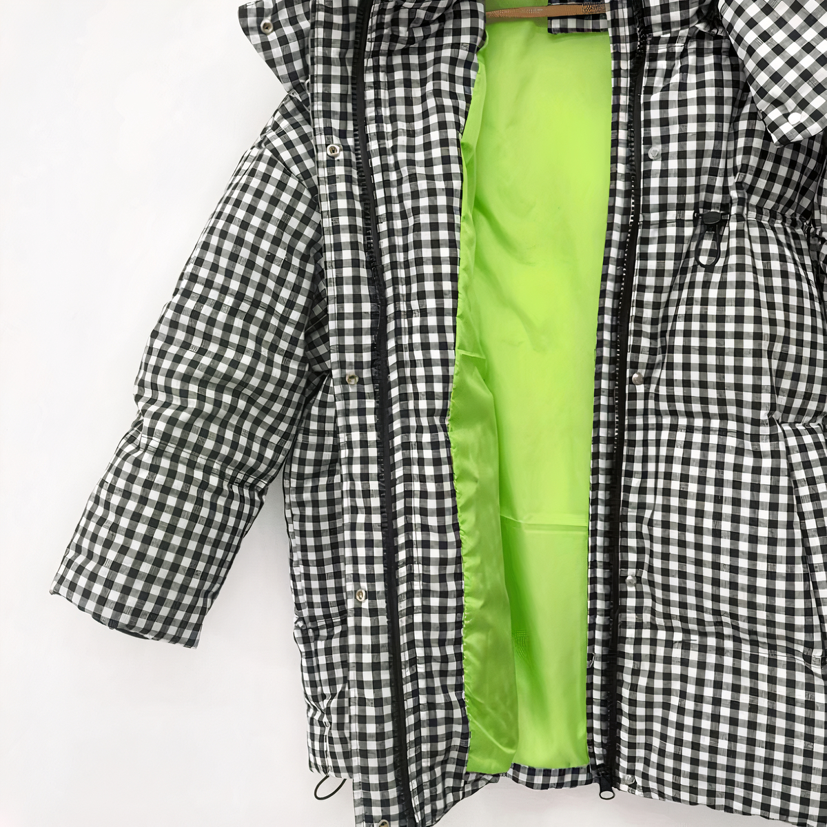 Damen-Daunenjacke mit Kapuze mit schwarz-weißen Karos