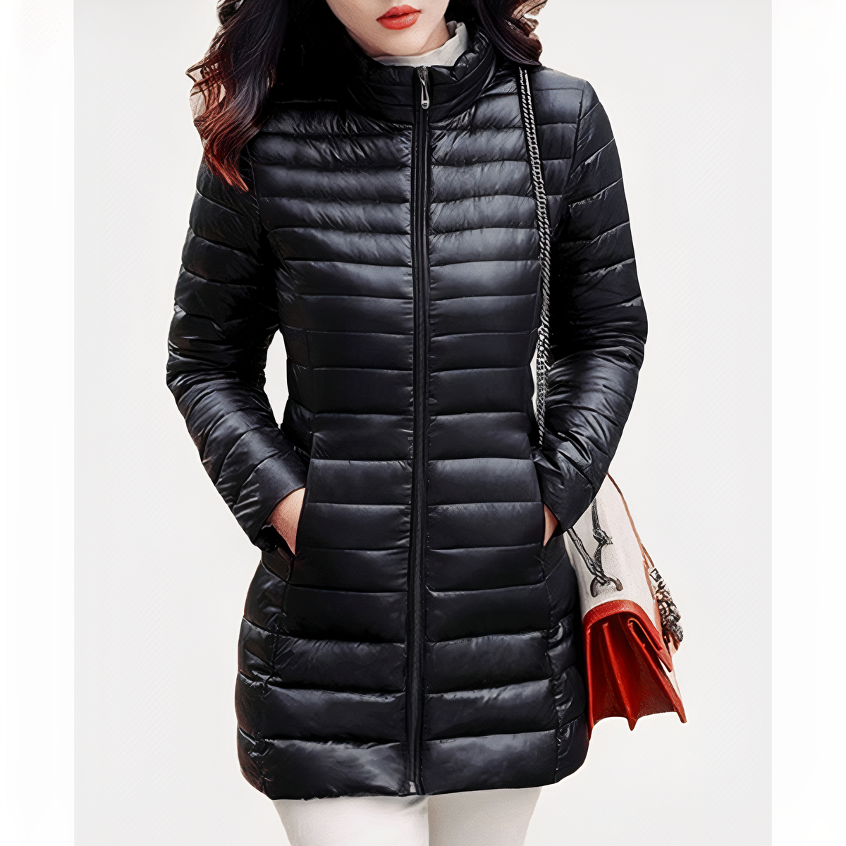 Schwarze, dünne, halblange Daunenjacke mit hohem Kragen für Frauen