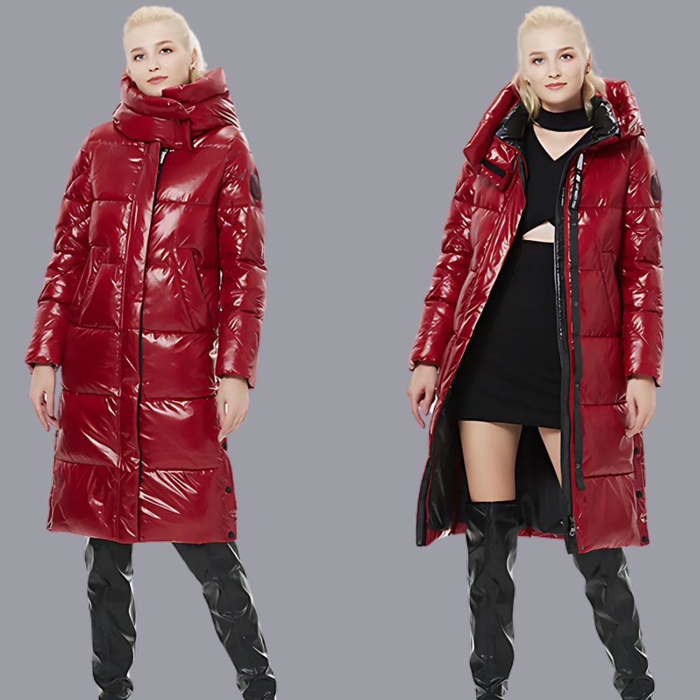 Lange, rot lackierte, gesteppte Daunenjacke für Frauen