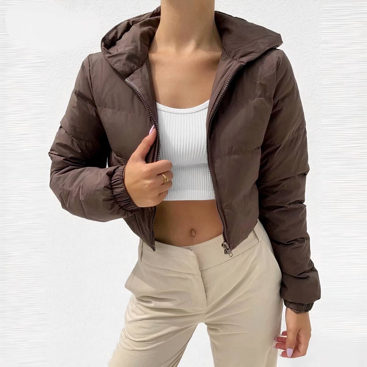 Kurze braune Daunenjacke mit Kapuze für Frauen