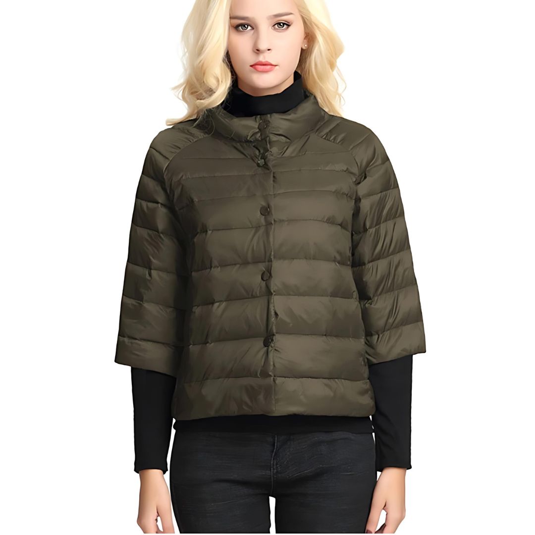 Was diese Daunenjacke wirklich einzigartig macht, sind die Dreiviertel-Ärmel, die Ihrem Stil einen originellen und modernen Touch verleihen. Sie bieten Bewegungsfreiheit und ermöglichen es, die Daunenjacke einfach mit anderen Kleidungsstücken in Ihrem Kleiderschrank, wie einem Pullover oder einer Jacke, zu kombinieren.