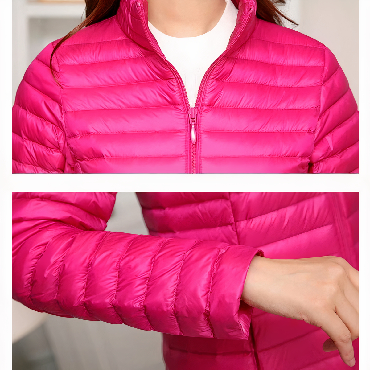 Diese halblange, dunkelrosa Daunenjacke für Damen zeichnet sich durch ihren taillierten Schnitt aus, der die Silhouette perfekt betont. Sie ist ideal für alle, die elegant aussehen und trotzdem vor Kälte geschützt sein wollen, und bietet einen femininen und modernen Stil.