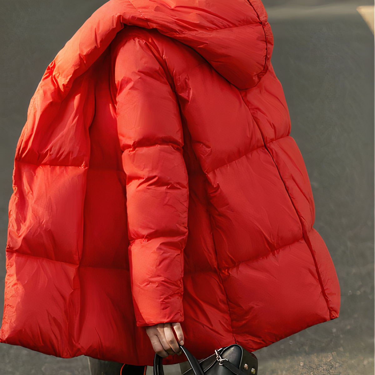Diese dicke rote Daunenjacke mit Kapuze ist der ideale Verbündete, um Sie in diesem Winter effektiv vor der Kälte zu schützen. Das voluminöse, gut gepolsterte Design sorgt für eine optimale Isolierung und hält Sie selbst an den eisigsten Tagen warm.
