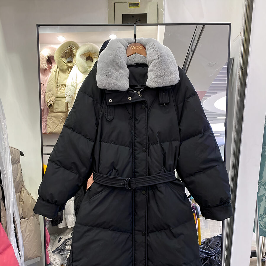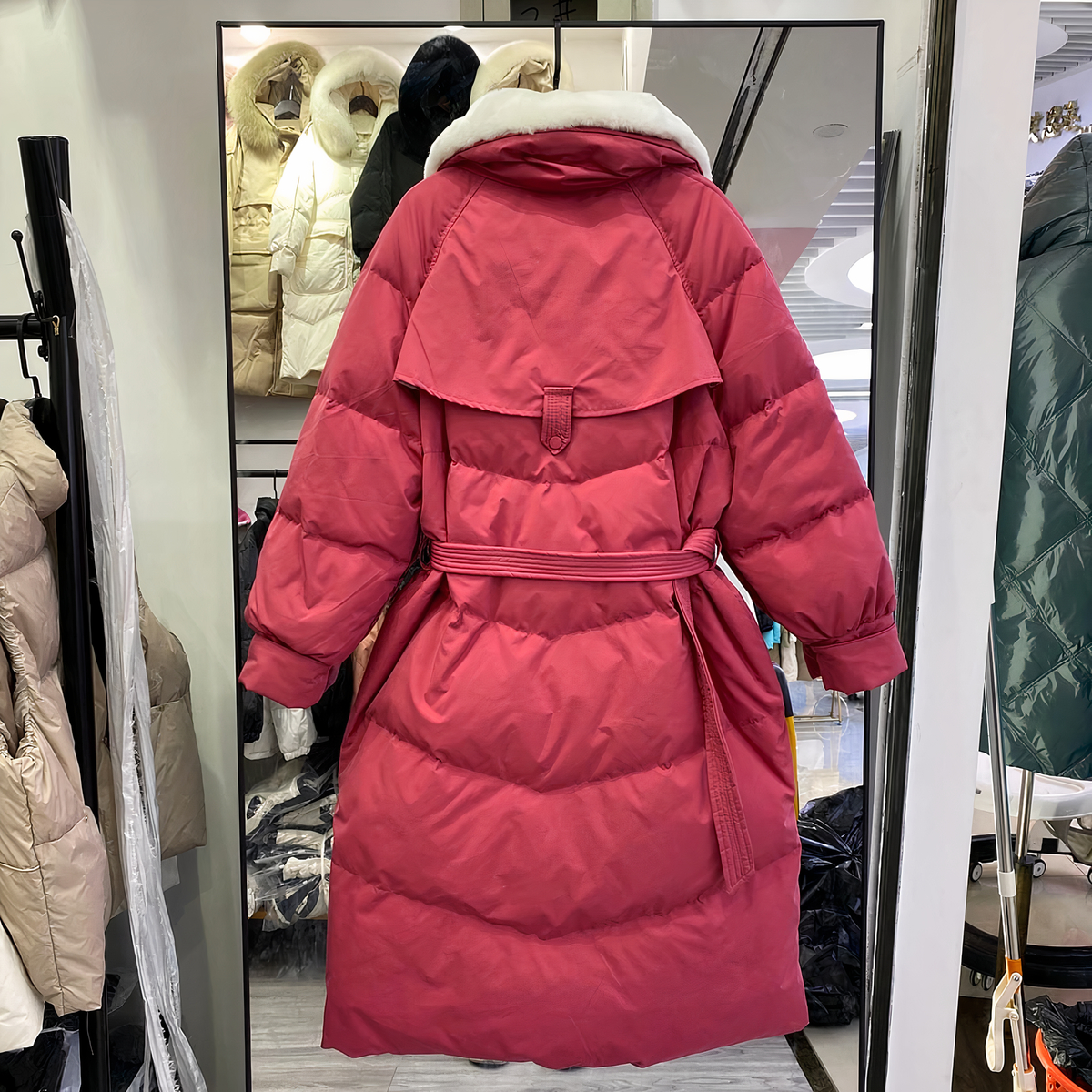 Lange Daunenjacke mit Pelzkragen und Gürtel für Frauen