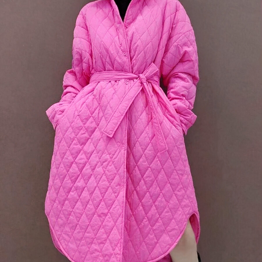 Die lange Schwangerschaftsjacke ist wattiert, um Sie während der Schwangerschaft warm und trocken zu halten. Sie ist mit einem verstellbaren Gürtel und einem hohen Kragen ausgestattet, um Sie vor Kälte zu schützen.