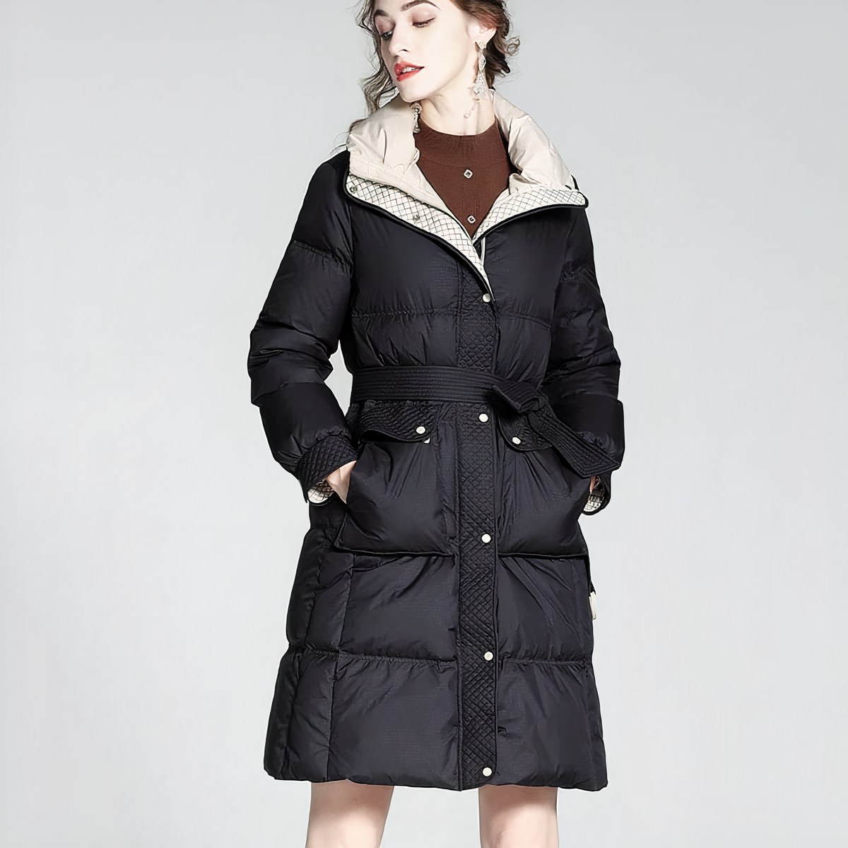 Unsere Daunenjacke ist in drei schönen Farben erhältlich, um Ihren Erwartungen zu entsprechen. Sie können zwischen braun, beige und schwarz wählen.