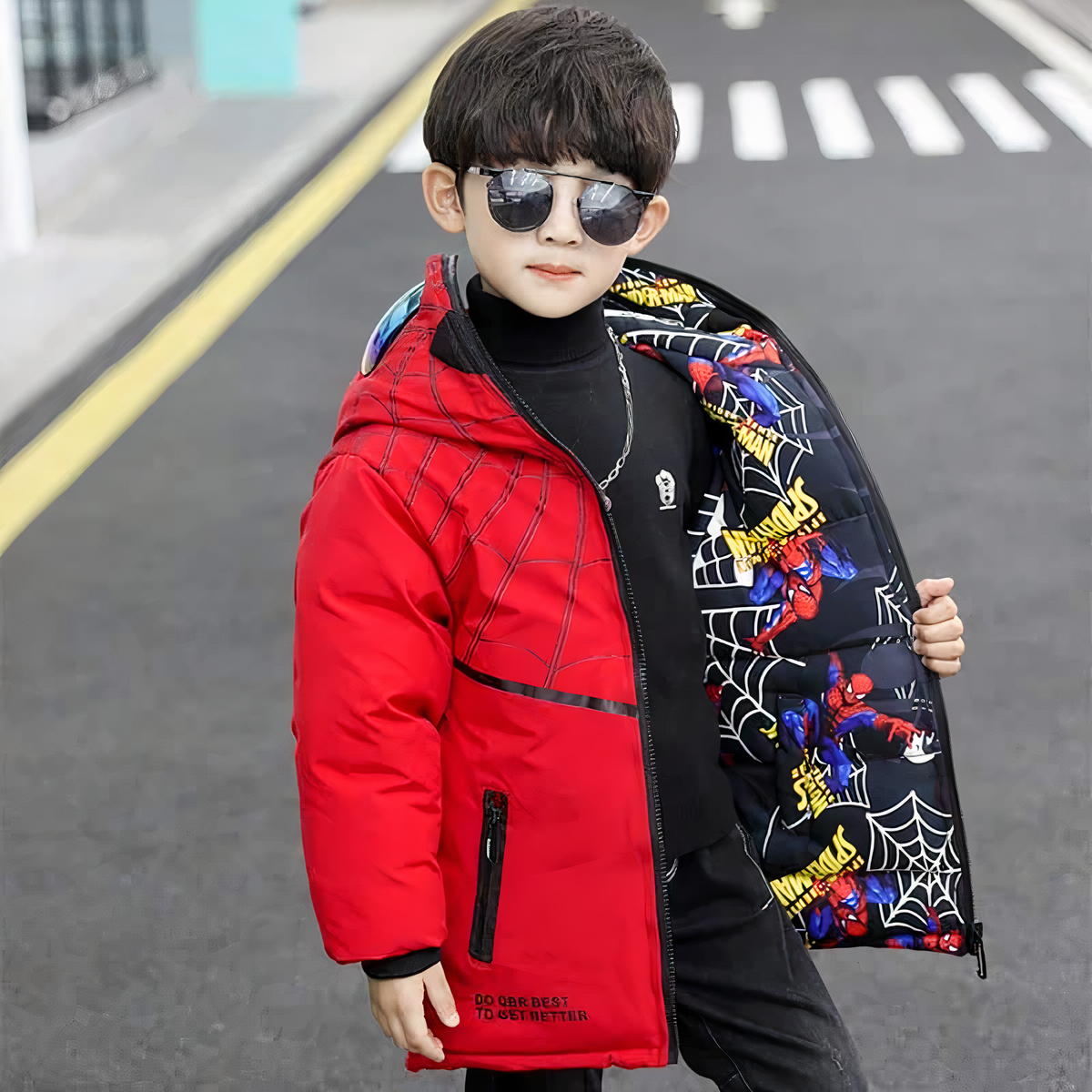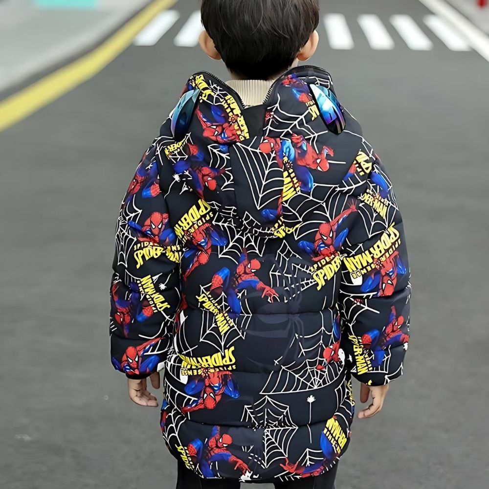 Diese hübsche, wendbare Daunenjacke für Kinder wird Ihren kleinen Lieblingssuperhelden sicher begeistern! Die Innenseite ist mit einem Spinnennetzmuster verziert, das Spider-Man-Fans garantiert begeistern wird, während die Außenseite einfarbig ist und sich weich anfühlt, perfekt zum Kuscheln, wenn es kalt ist.
