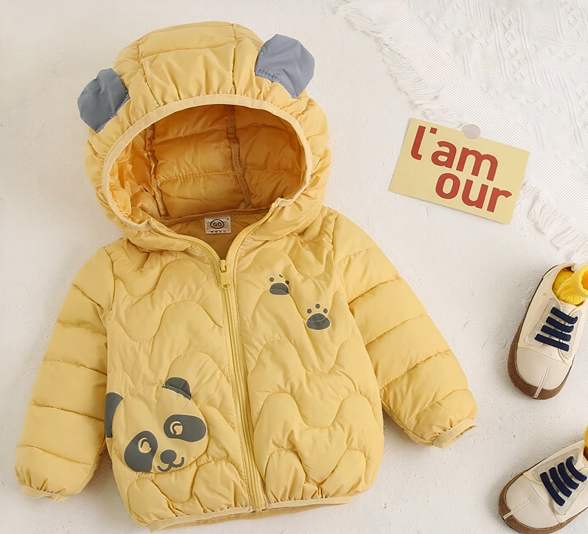 Dünne warme senfgelbe Daunenjacke mit Panda-Muster für Kinder